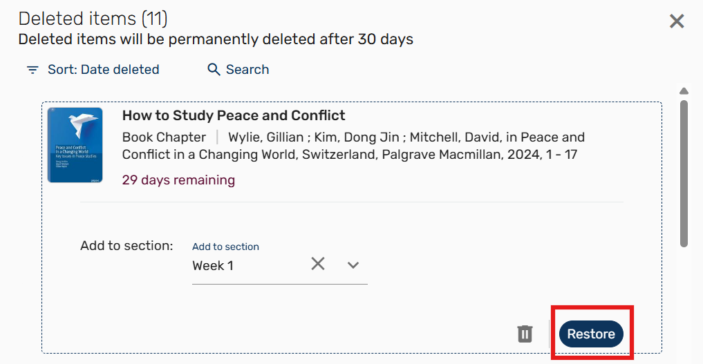 Yes, Leganto will keep your deleted items for 30 days. To view your deleted items, go to the right hand sidebar in your reading list and click on the deleted items icon.